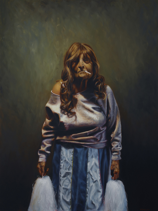 Jason Bard Yarmosky’s most current body of work Elder Kinder addresses the innocence at both ends of the generational spectrum. Yarmosky recruits his eager Brooklyn-born grandparents, two models very close to him, to pose in an assortment of playful costumes. Whimsical yet grounded in their age, each portrait finds a balance between vulnerability, empowerment, and pride. Using multiple layers of oil paint, Yarmosky employs dramatic lighting to create depth, literally and metaphorically. Each character’s stark pose accentuates the inconsistencies of age and appearance. Ranging from a shirtless cowboy to a pensive pink bunny rabbit, Yarmosky’s subjects explore the intersection of jaded seniority and the audacity of youth.