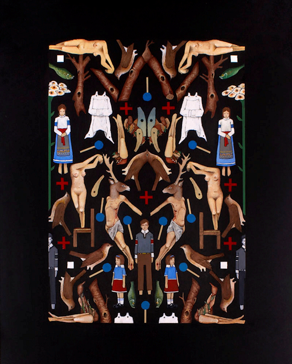 David Ruhlman, a self taught painter primarily works in gouache on wood panel. He also creates books, collages, and installations, all using found objects. David’s work has appeared in shows at the Salt Lake Art Center, The Object Gallery, Finch Lane, Atlanta Georgia, Houston Baptist Universtiy, The Pickle Company, London International Festival of Surrealism 2008 and Tangermünde, Germany.